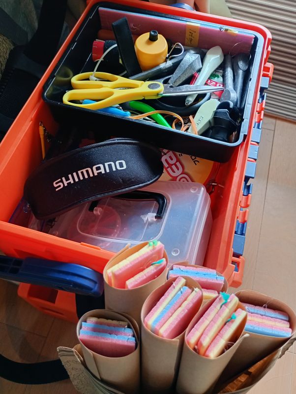 タックルケースと、配布用仕掛け18本。もう夏近いし偏光サングラスや日焼け止めは必須。